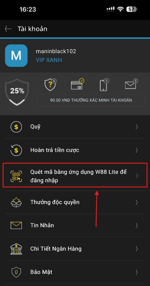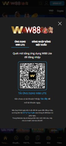 Bước 4: Bạn bấm vào dòng chữ ” Quét mã bằng ứng dụng W88 Lite để đăng nhập ”