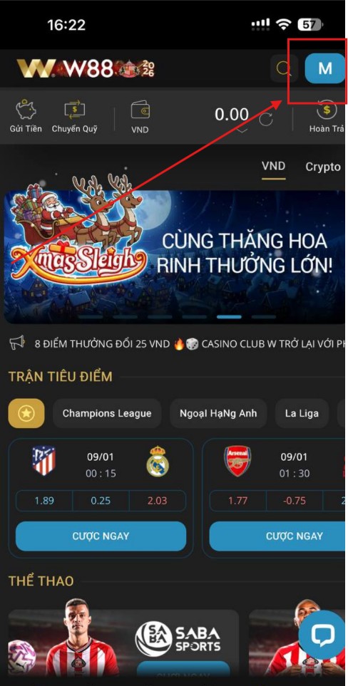 Bước 3: Tại trang chủ W88 bạn bấm vào biểu tượng hiển thị chữ cái đầu của tên đăng nhập ( Góc trên bên phải màn hình )